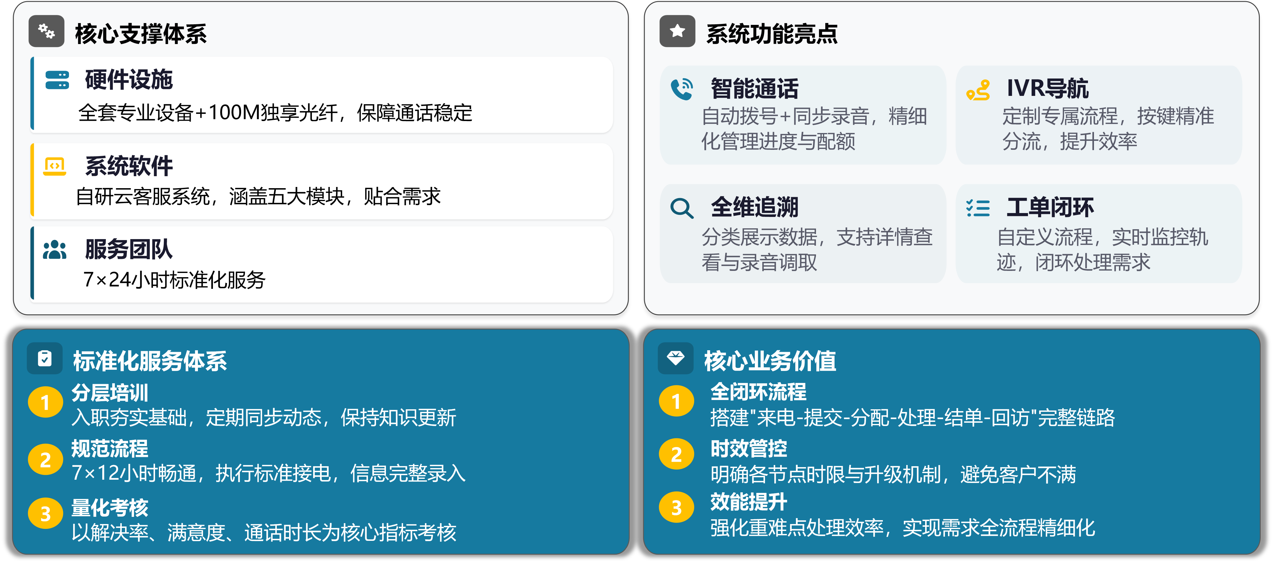 集团400外包服务依托自研云客服系统及硬件、团队等核心支撑,打造智能通话、工单闭环等功能,建立标准化服务体系,实现客户需求全闭环精细化管理,高效提升服务体验与效能。