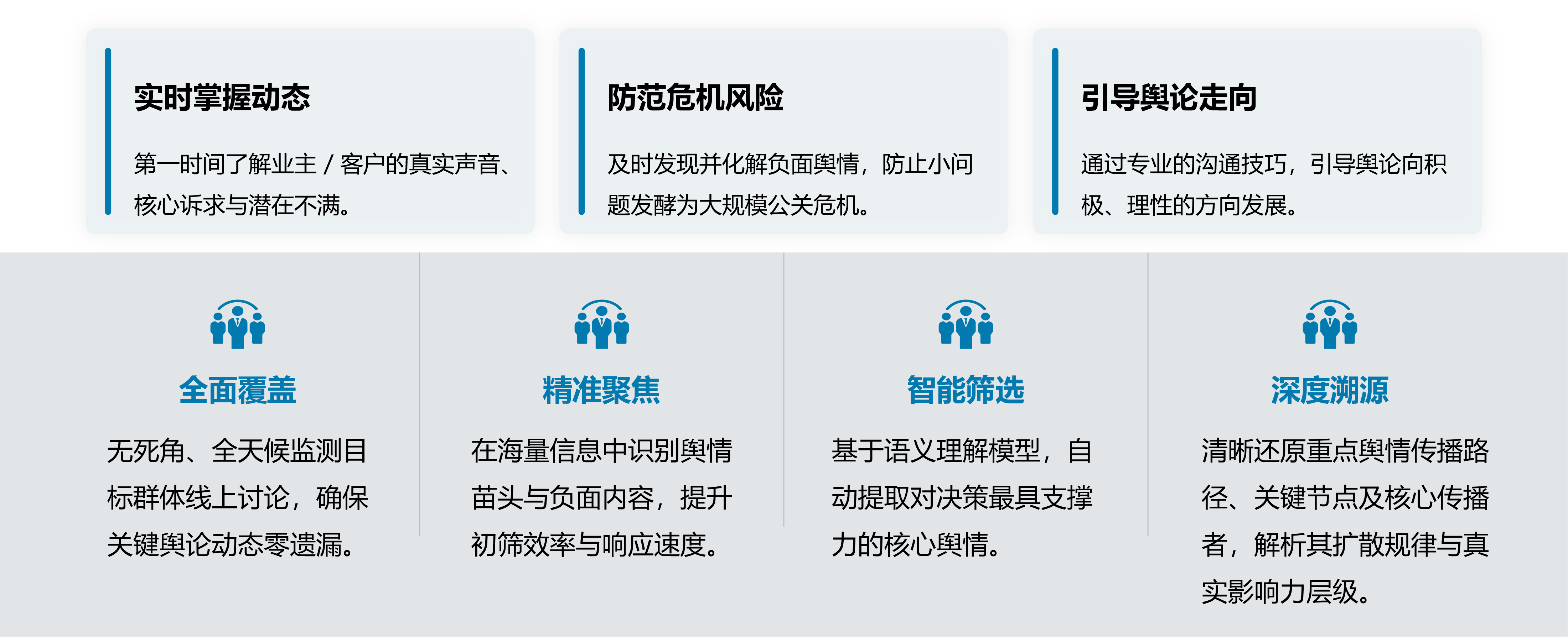 舆情服务包含检测分析与危机公关全流程,凭借全面覆盖、精准溯源等能力,实时掌握舆论动态、化解负面风险;通过科学化的危机应对步骤,快速处置舆情、引导舆论走向,有效维护品牌形象。